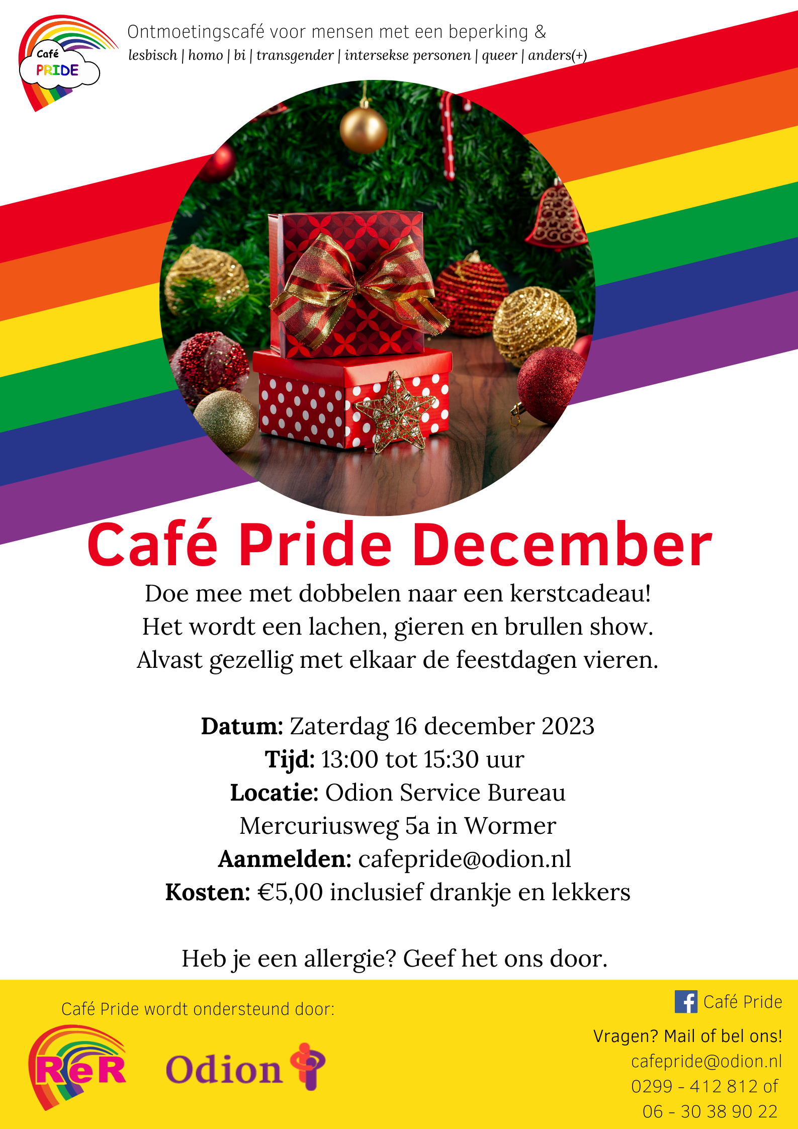 Op zaterdag 16 december van 13:00 tot 15:30 heeft Café Pride een bijeenkomst voor mensen met een beperking wie daarnaast lesbisch, homoseksueel, biseksueel, transgender, intersekse personen zijn of zich hieraan verwant voelen.