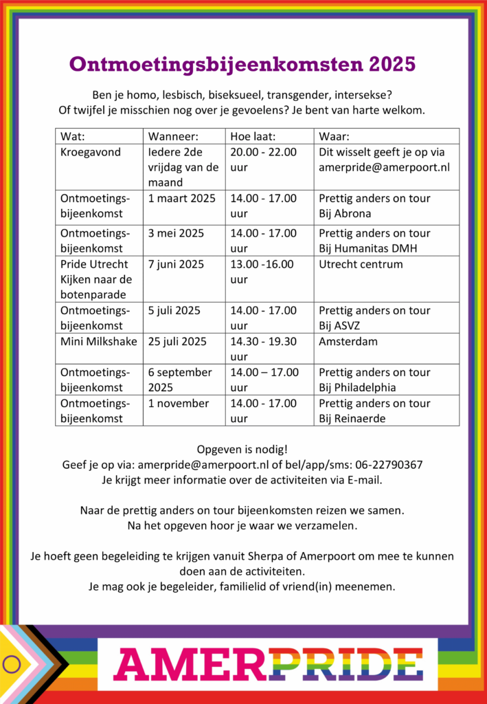 Voor aanvullingen, vragen of opmerkingen mail dan naar amerpride@amerpoort.nl of bel met coordinator Mike tel. 06 – 2279 0367. Het hangt van de activiteit af of deze rolstoeltoegankelijk is en of er een invalidentoilet is, deze informatie wordt per keer per mail gegeven.