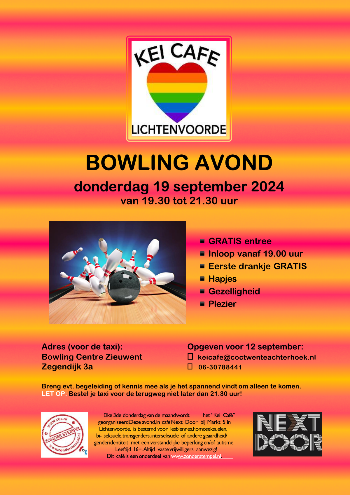 Deze avond, in café Next Door bij Markt 5 in Lichtenvoorde, is bestemd voor lesbiennes, homoseksuelen, bi-seksuele, transgenders, interseksuele of andere geaardheid/genderidentiteit met een verstandelijke beperking en/of autisme.