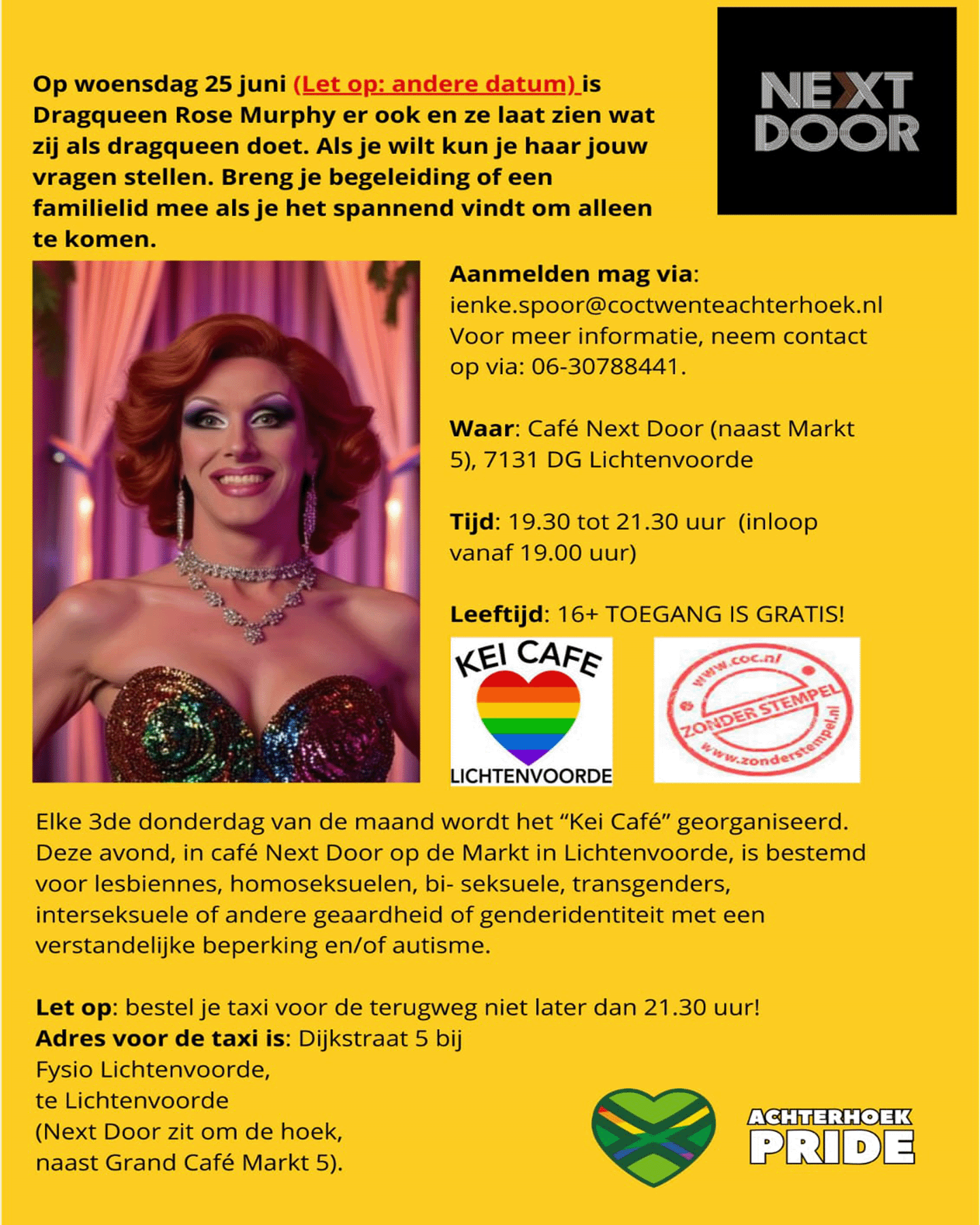 Op woensdag 25 juni wordt Café Next Door in Lichtenvoorde omgetoverd tot een kleurrijke en inspirerende ontmoetingsplek. Dit is een afwijkende datum, want normaal gesproken vindt het Kei Café elke derde donderdag van de maand plaats. Maar deze keer maken we een uitzondering voor een speciale avond met Dragqueen Rose Murphy!