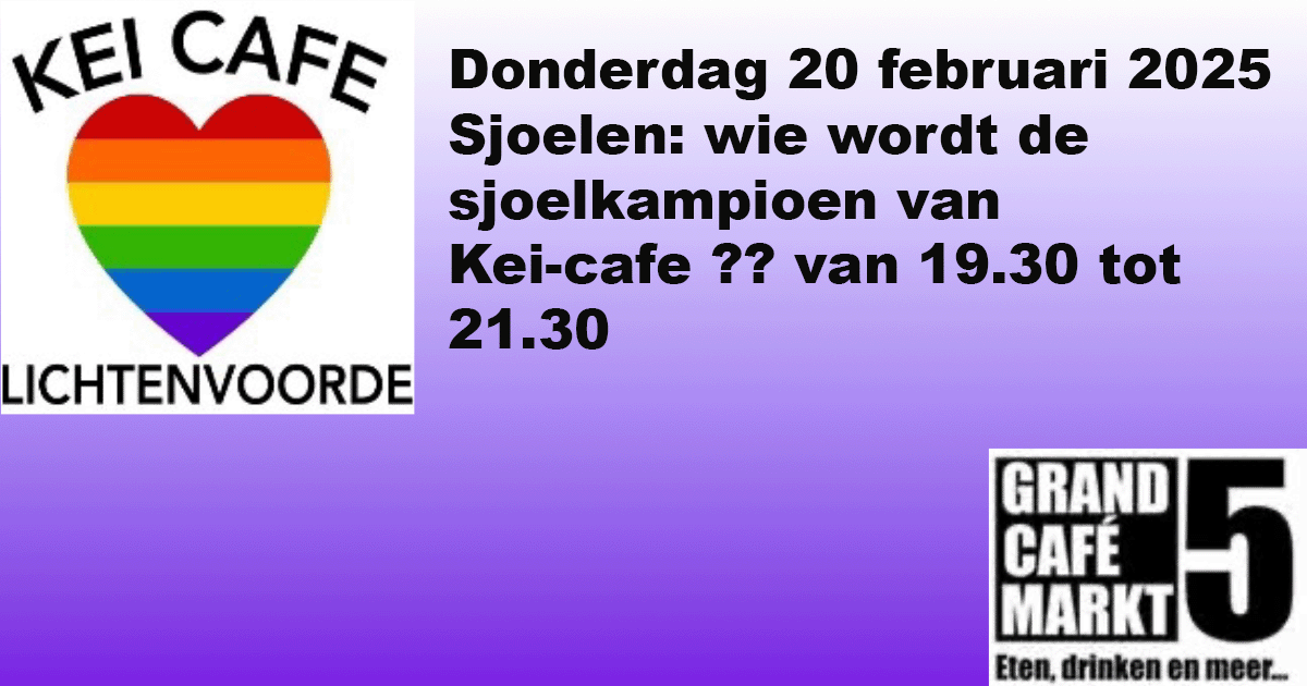 Kom op donderdag 20 februari 2025 naar onze gezellige sjoelavond en strijd om de titel sjoelkampioen van Kei-cafe! Iedereen is welkom en de entree is gratis. Bovendien krijg je bij binnenkomst een gratis drankje.
